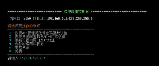 (3)輸入3 重新設置路(lù)由器(qì)內(nèi)網接口及IP地(dì)址;默認網卡為(wèi)eth0 IP 192.168.0.1