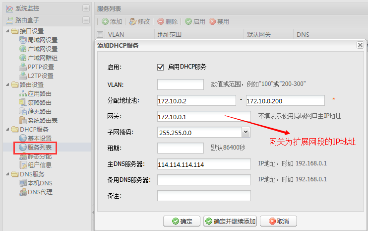 分(fēn)配✘地(dì)址池:為(wèi)擴展網段的(de)範圍內(nèi) 網關 子(zǐ)網掩碼:選擇擴展的(de)IP地(dì)址及掩碼相(xiàng)對(duì)←應。