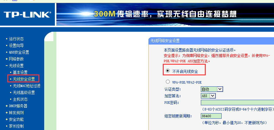 1)電(diàn)腦(nǎo)連接進入無線路(lù)由器(qì)管理(lǐ) 界面—無線設置—無線安全設置—不(bù)開(kāi)啓無線安全(目的(de):不(bù)設置WIFI連接的(de)密碼)